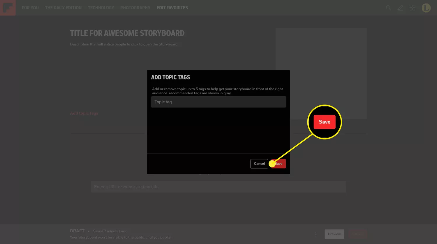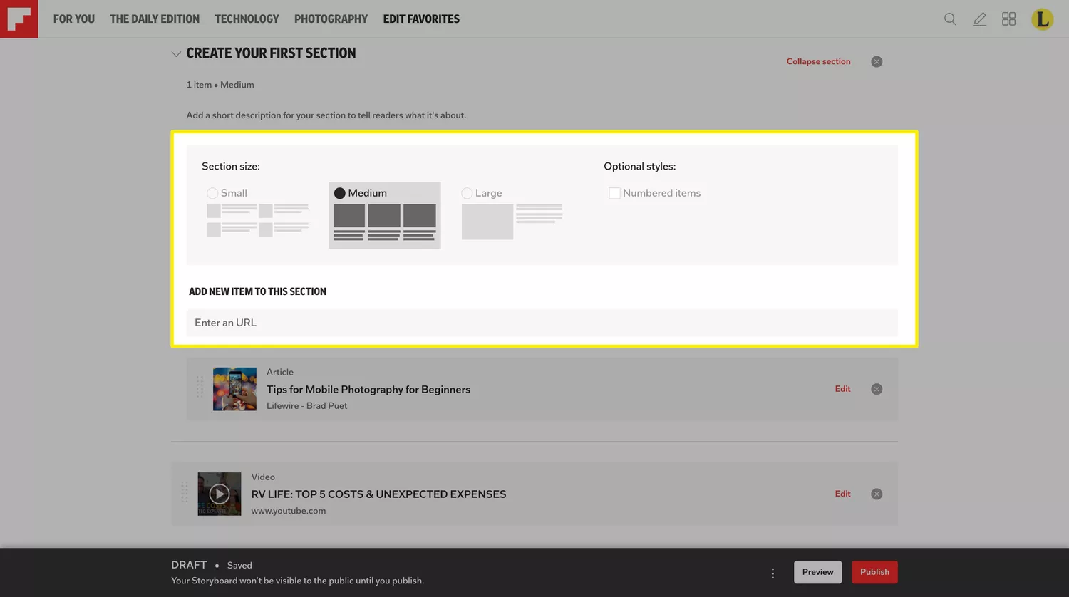 الخطوة 6: لإضافة قصص إلى قسم في القصة المصورة ، اضغط على تحرير على الجانب الأيمن الأقصى من عنوان القسم.