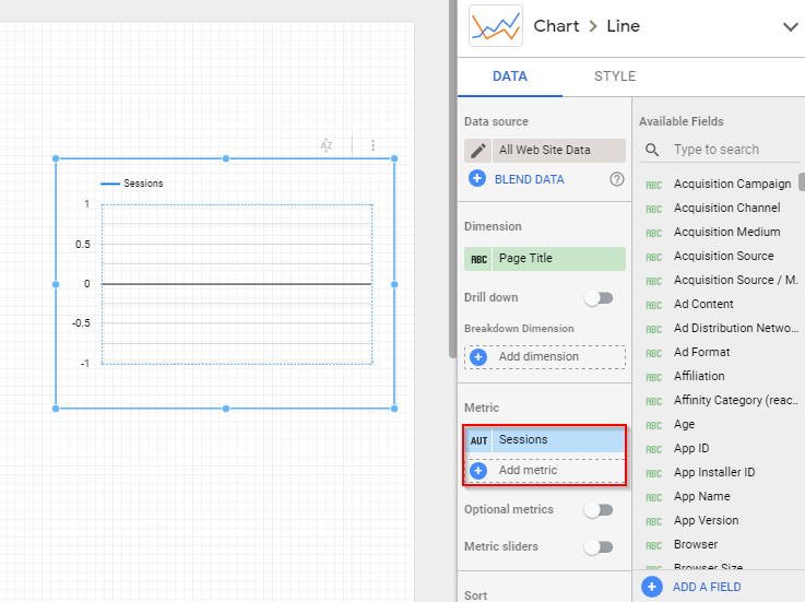 Pro Tip: If you have purposely changed the data source, add the desired dimension or metric. If you haven’t, click “Refresh Fields” or reconnect to the data source.