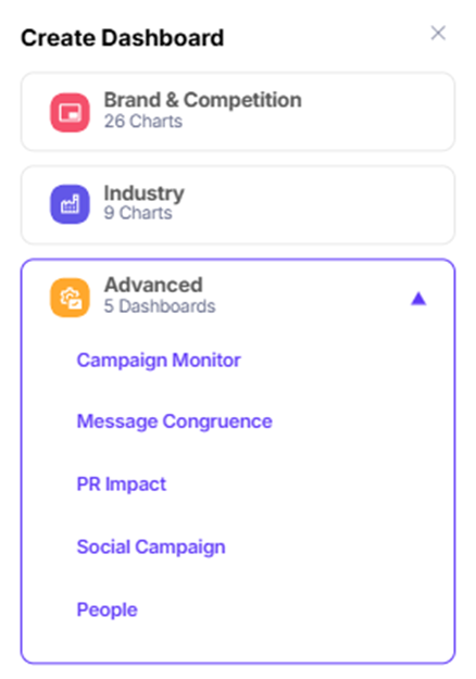 Além do monitoramento geral de mídia, o painel avançado do AlphaMetricx foi projetado para usuários com mais conhecimento que exigem análises aprofundadas. Alguns dos painéis avançados incluem Monitor de Campanha, Impacto do Autor, Sentimento por Tema, Congruência de Mensagens e Impacto de RP.