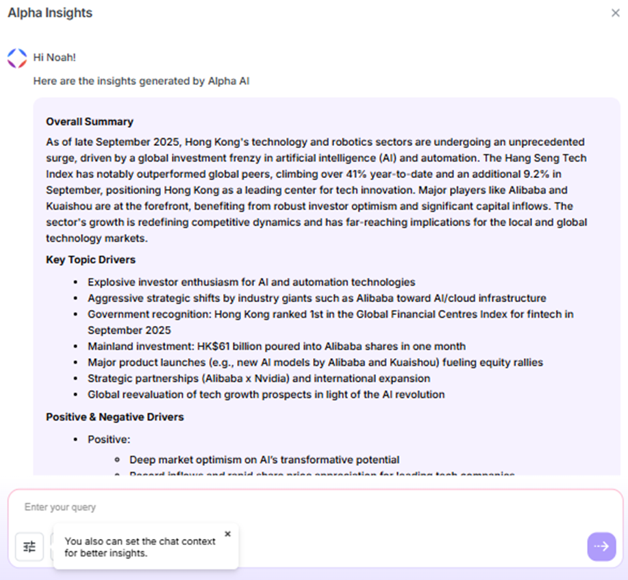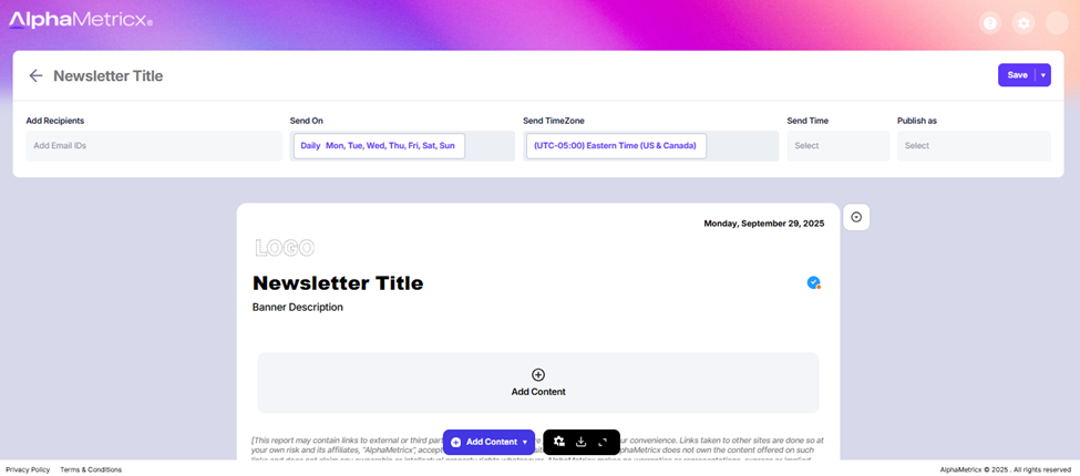 Um dos principais pontos fortes da plataforma AlphaMetricx é o grau de personalização que ela oferece. As organizações agora têm a opção de criar newsletters alinhadas às necessidades específicas de diferentes equipes, em vez de depender de atualizações genéricas. Tudo pode ser amplamente personalizado – listas de entrega, elementos de branding, insights, gráficos ou artigos completos.