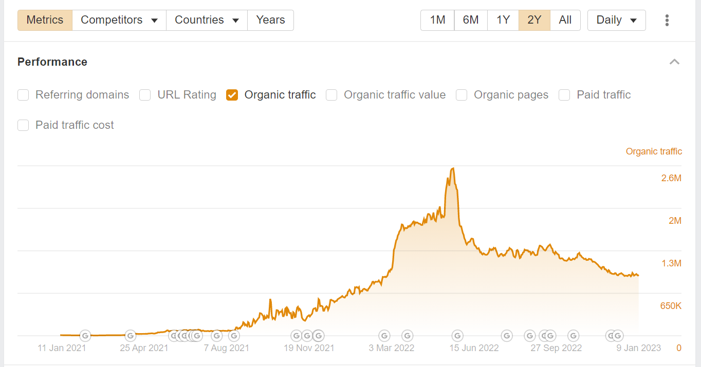 Tulad ng nakikita mo mula sa tsart ng Ahrefs sa ibaba ,, sa bahagi, lalo na sa nakaraang dalawang taon na nagresulta ito sa isang makabuluhang paglipat sa pamamahagi ng trapiko sa pamamagitan ng bansa patungo sa pagiging mas internasyonal.